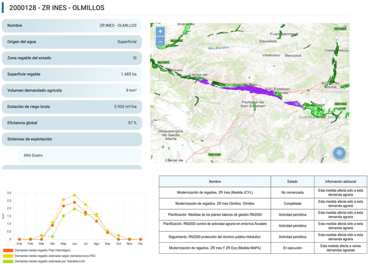 Esta es una información, que, por su importancia como soporte para los trabajos del plan hidrológico, merece destacarse entre los contenidos que se desplieguen en el sistema de información. Existen ejemplos que pueden tomarse como referencia para presentar este tipo de datos, tanto en sus detalles alfanuméricos como espaciales. Ejemplo: https://mirame.chduero.es/chduero/public/demands/agrarianDemands